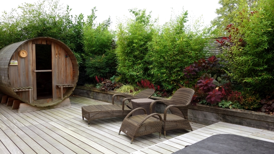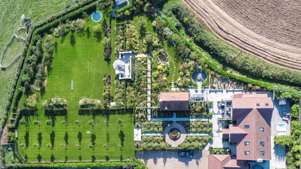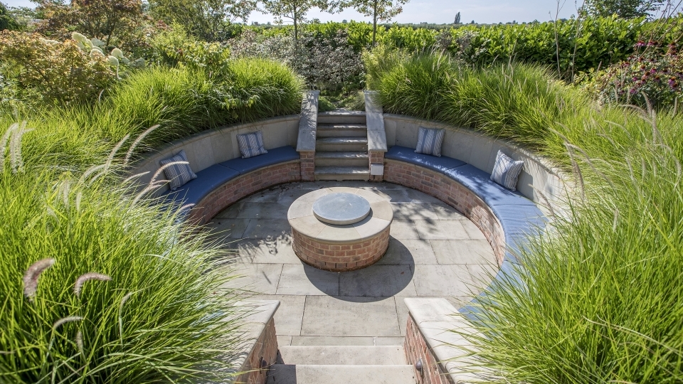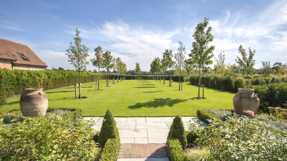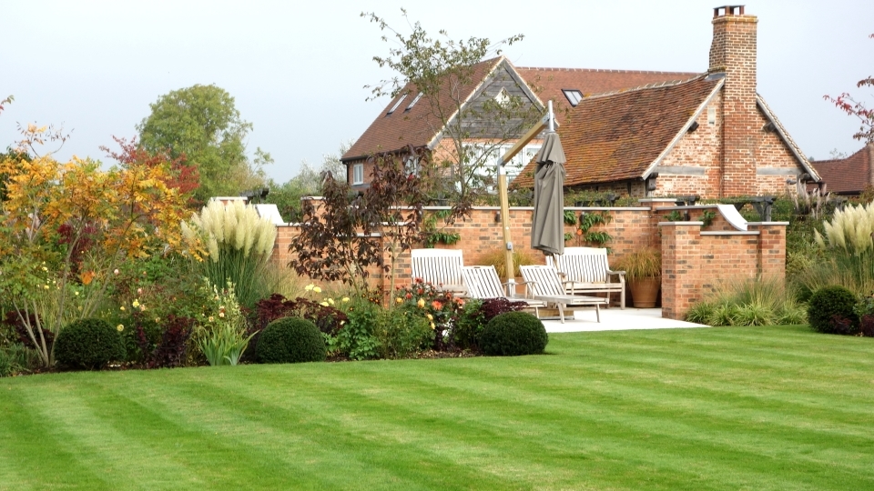 Classic oak pergolas covered with rambling roses separate the parterre garden from the rest of the garden. On either side of a pergola walkway are large borders brimming with shrubs and perennials, here soft accents of pinks, whites and purples create a feeling of cool air. Stepping stones meandering through plantings of grasses and hydrangeas, which leads you on into a pond garden encircled by acers (for superb autumn colour) and Cornus Kousa (for its late spring stunning display). A field area for family activities is softened at the edges with mass contemporary plantings of grasses, dog woods, amelanchier, which are overlooked by a lounging area bordered with shrubs of mainly oranges, amber and yellows for summer colour. To the side of the main house is a sunken fire pit and nearby, a gravel herb garden is adorned with an abundance of terracotta pots. At the back of the house is a decked area for a sauna and hot tub where tall bamboo give dappled screening from the neighbouring properties. Terraces around the property provide places for seating and outside dining.