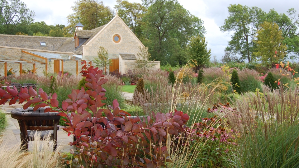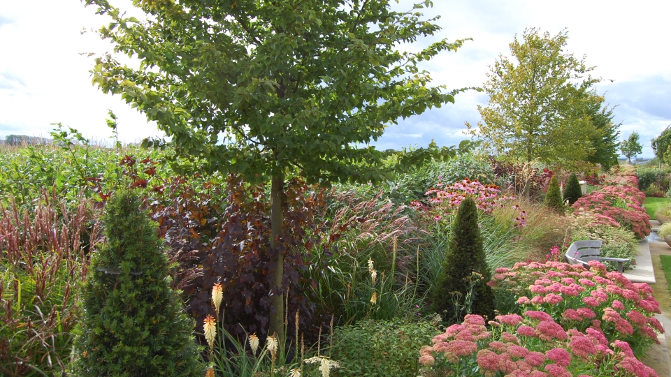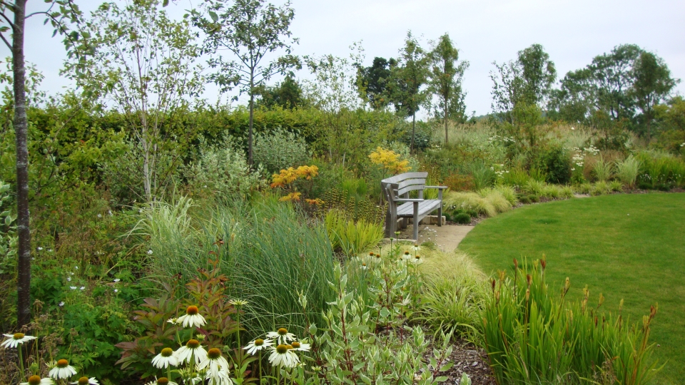 Each garden was given a different colour accent – the main garden, apricots and warm pinks, the long garden blues and yellows, the herb garden lavender and the rose garden burnt oranges.