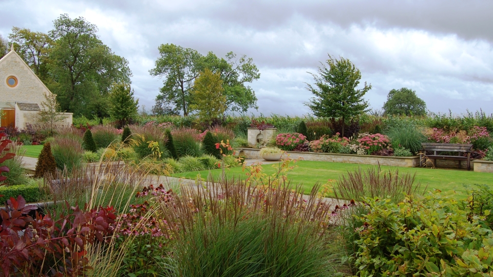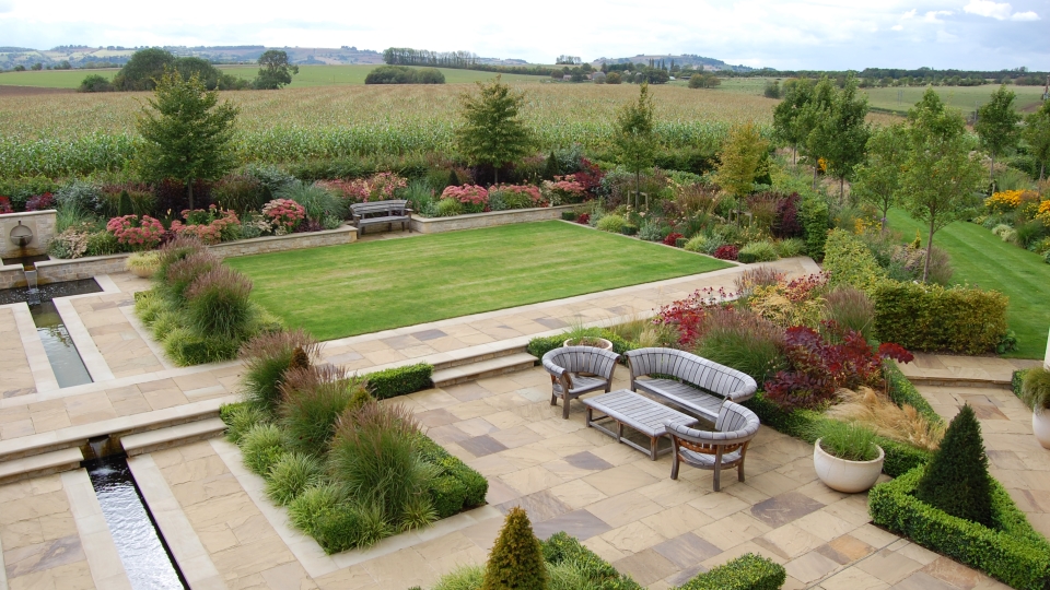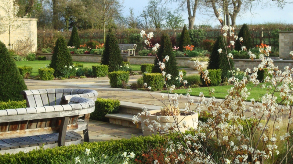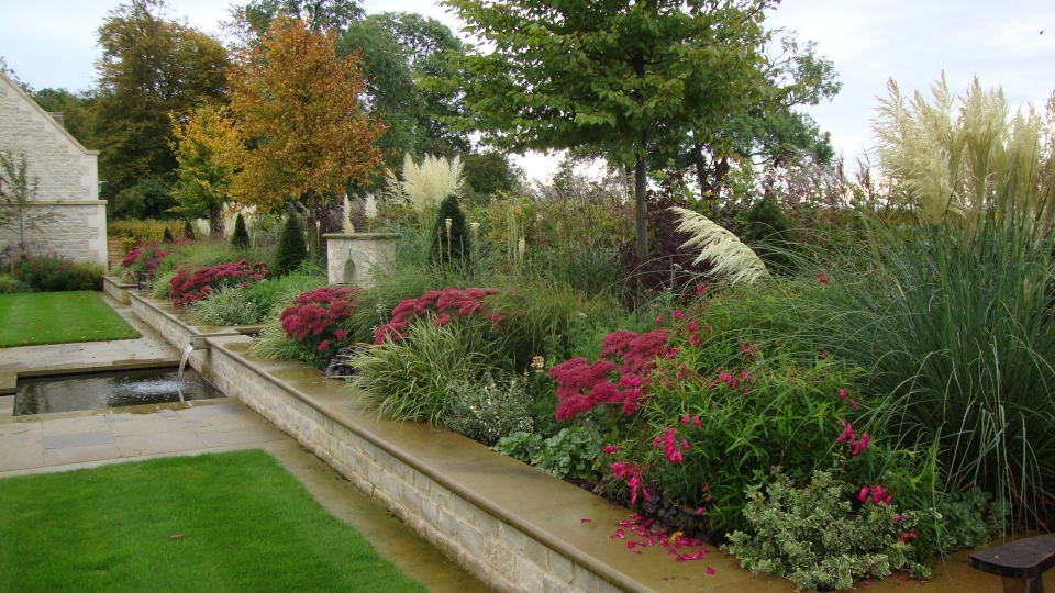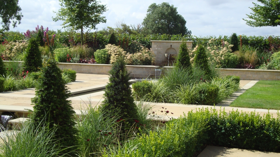The garden sloped up from the house towards the fields beyond, so new levels were established to form terraces and raised planting beds. A central rill was constructed with water flowing down from an upper bowl fountain into two lower pools with bell fountains, towards the house below. The walls and steps were built in stone to compliment the buildings. The grounds were divided into areas by hornbeam hedges to provide interest, to shield the adjacent fields and to give protection from the harsh winter winds.