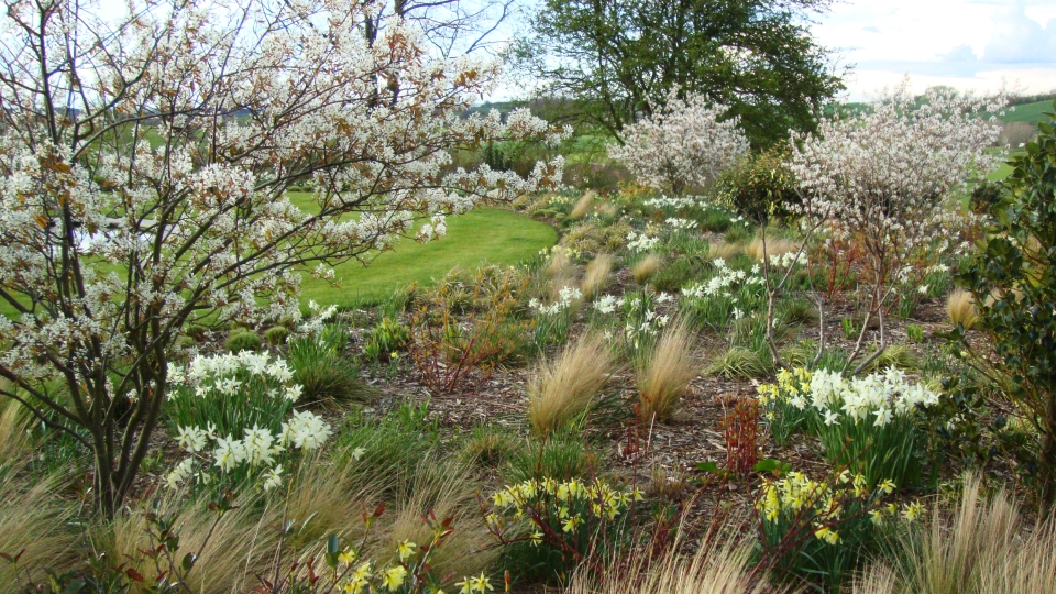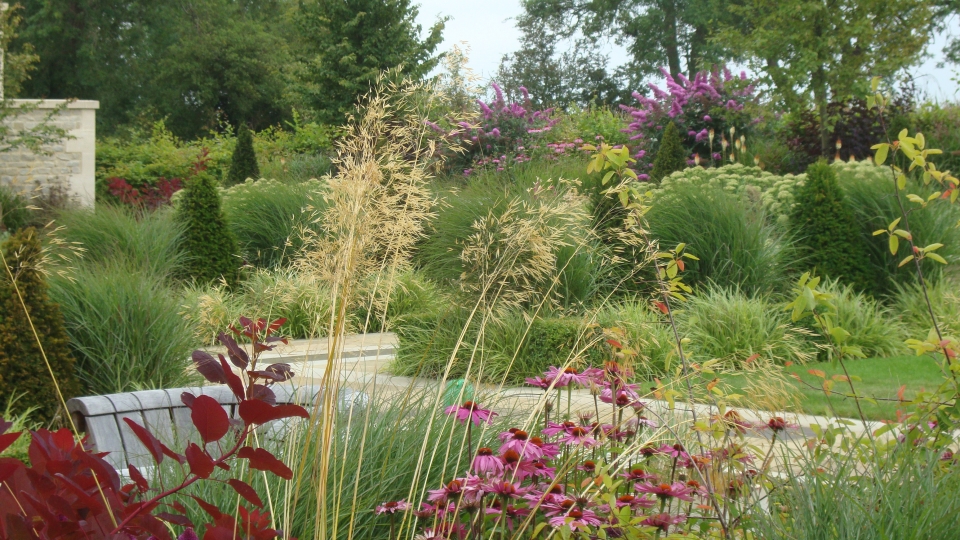 This beautiful garden was constructed over a two year period and has now matured. The wide borders are filled with tall evergreen shrubs for winter accent and softened with massed plantings of colourful perennials and gentle grasses.
