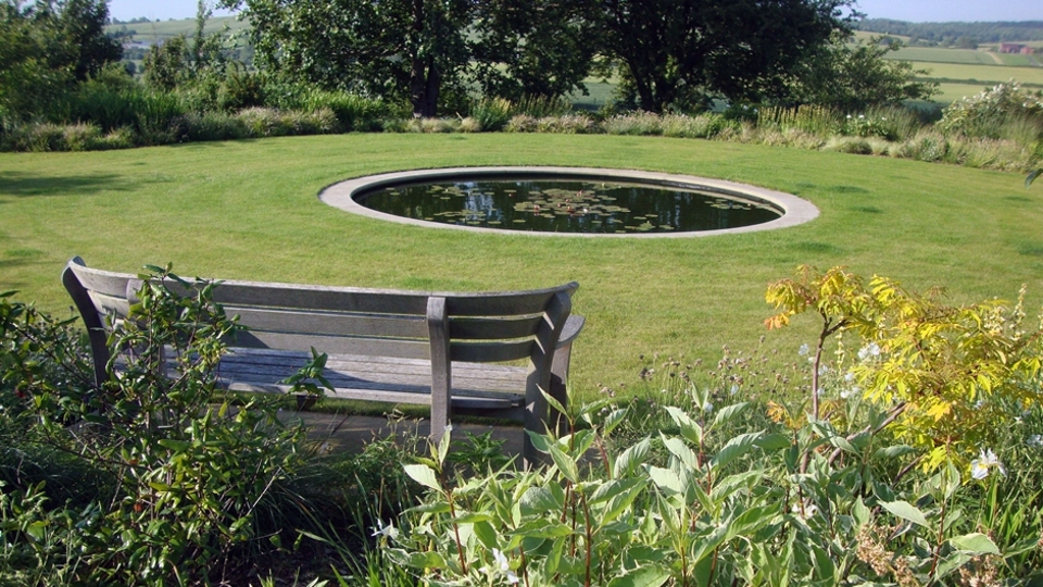 At the front of the property, a still circular pool blends with a wild flower meadow. Swathes of grasses blow in the wind, complimented by flowers of soft creams and whites.